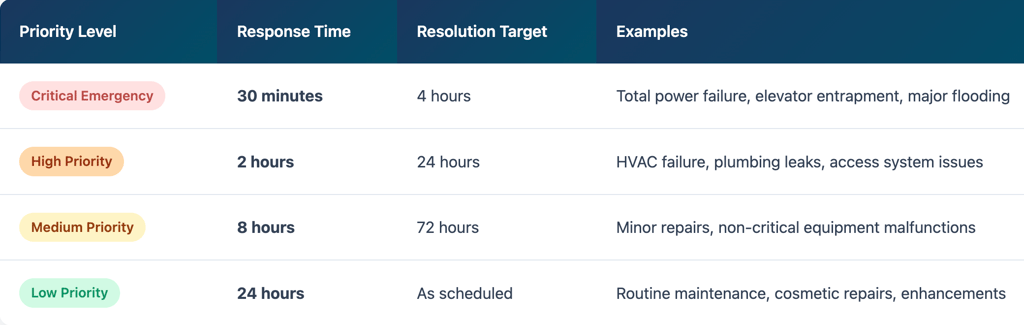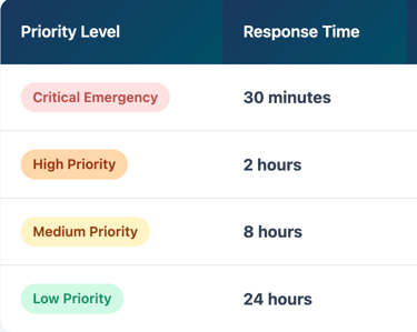 NOTE: The above response times are typical SLAs for our Comprehensive Contract Clients on our long term Building Maintenance or Integrated Facility Management agreements.